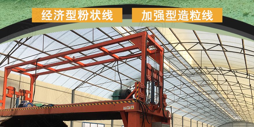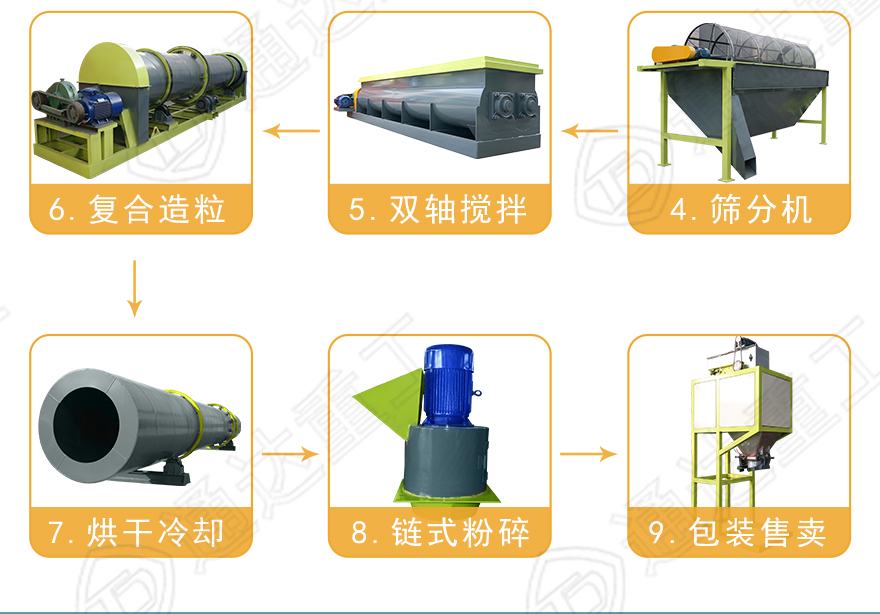 高配置:發(fā)酵翻堆機(jī)、半濕物料粉碎機(jī)、臥式攪拌機(jī)、動(dòng)態(tài)配料設(shè)備、造粒機(jī)、烘干機(jī)、冷卻機(jī)、滾筒篩分機(jī)、拋圓機(jī)、包膜機(jī)、包裝設(shè)備、皮帶輸送機(jī)等。
